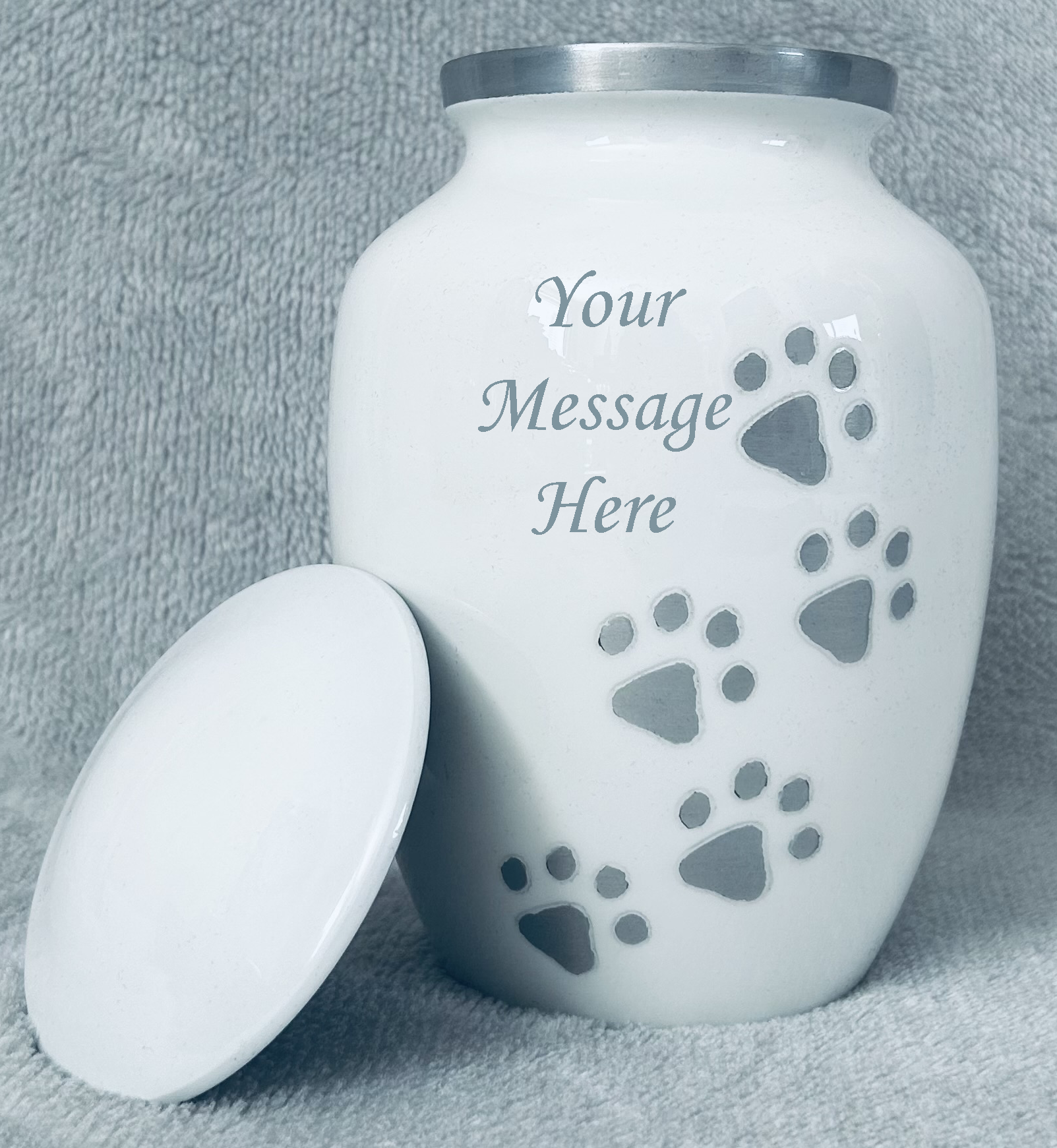 Our white paw-print pet cremation urn is handmade from start to finish making each and every urn unique. The paw prints have been engraved into the aluminium urn by hand down one side to stand out just as your loved pet did.